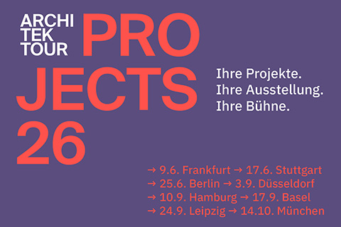 Die Heinze ArchitekTOUR PROJECTS26 ist die Plattform für Ihr Büro und Ihr Projekt. Präsentiert werden Arbeit, Entwurfshaltung und Perspektiven an einem von sieben Standorten in Deutschland oder in der Schweiz – vor qualifiziertem Fachpublikum aus Architektur, Planung und Industrie.